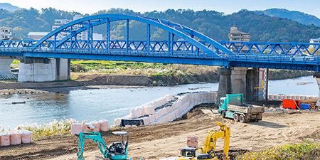 橋梁・トンネル・道路などの交通インフラをより円滑、安全に運用する整備工事をはじめ、山林の地すべり・土砂崩れ、河川の氾濫、堤防の決壊などの自然災害を未然に防ぐための対策工事など、あらゆる土木工事をオールマイティに行っています。